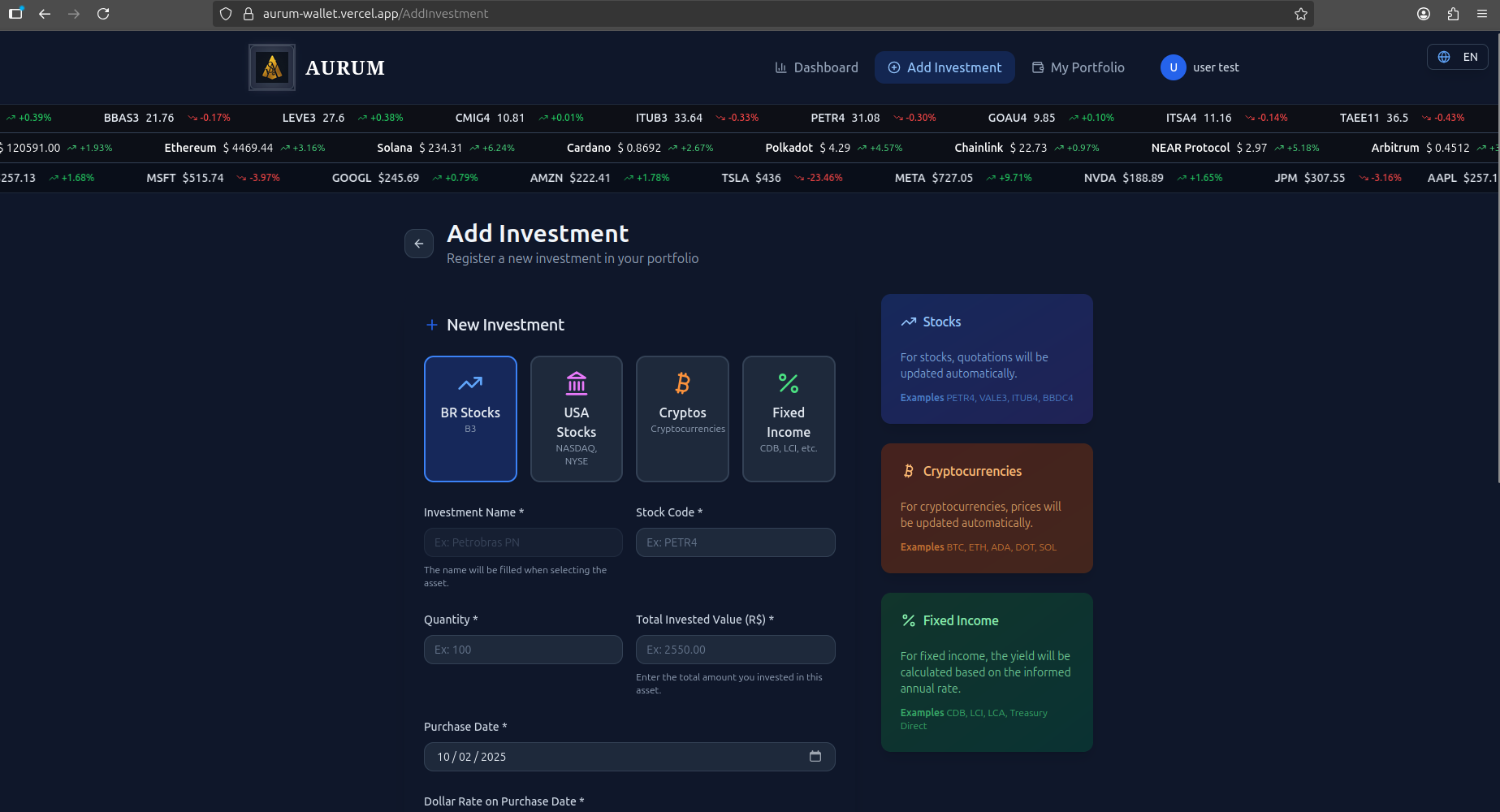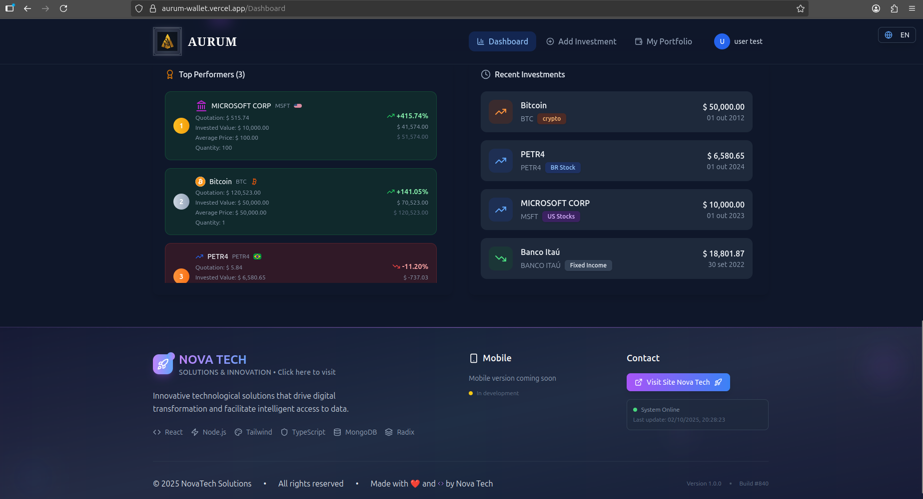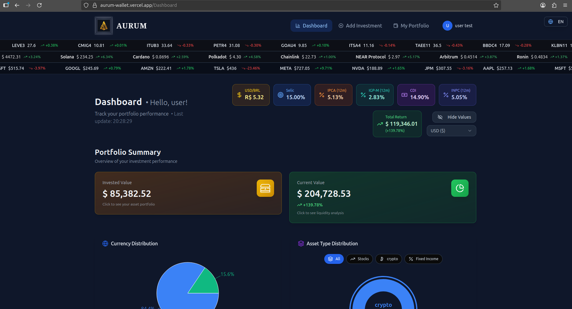 Aurum FrontEnd — Real‑time Investment Dashboard. React frontend for portfolio tracking and real-time quotes, focusing on network resilience, responsive UX and extensible architecture. Integrates WebSockets for market streaming and REST API for secure operations.