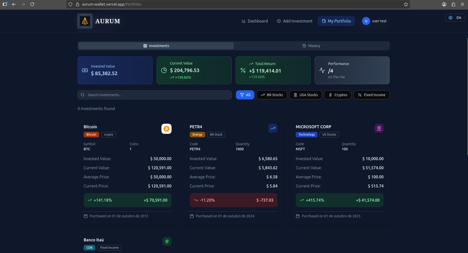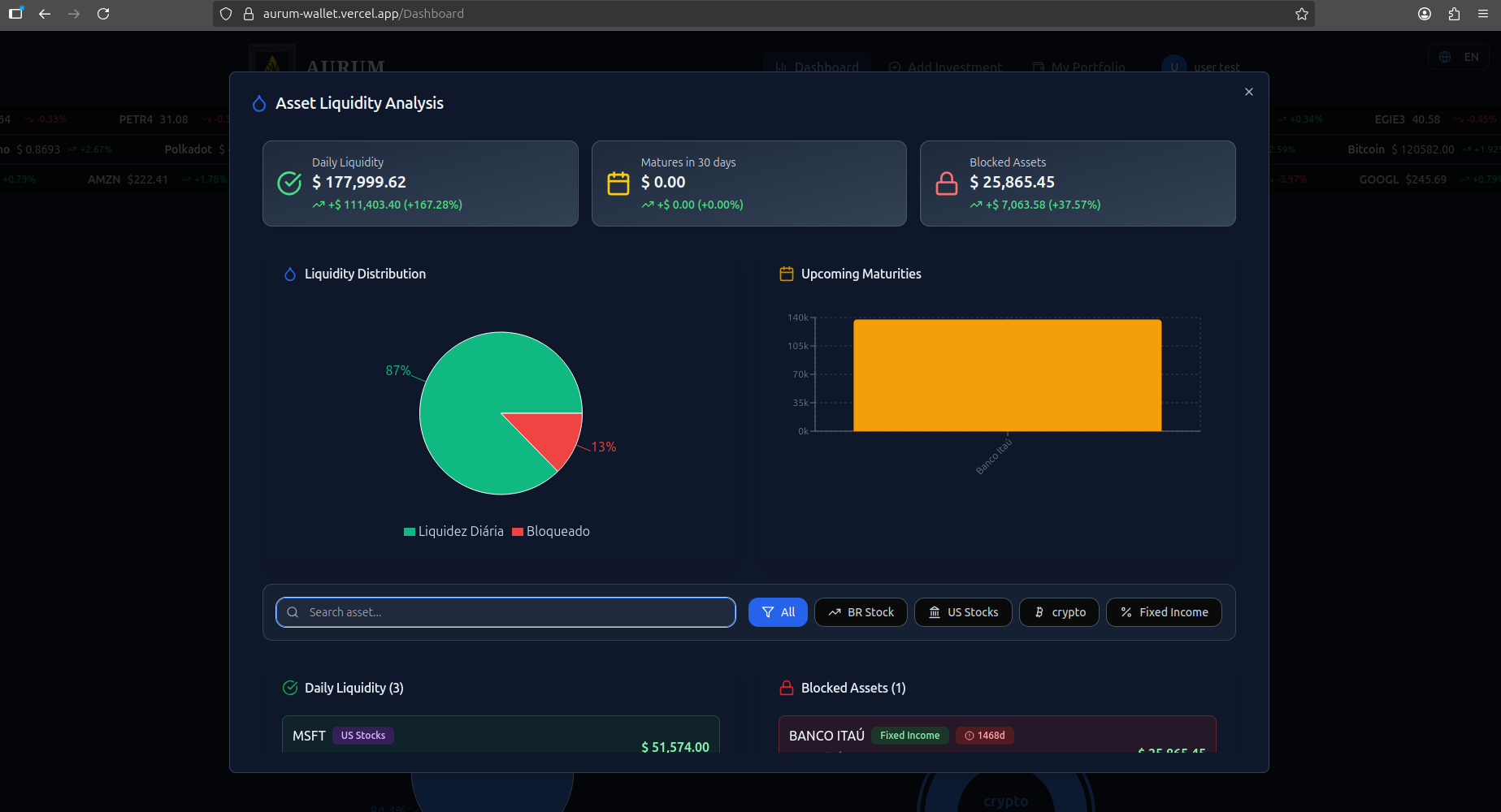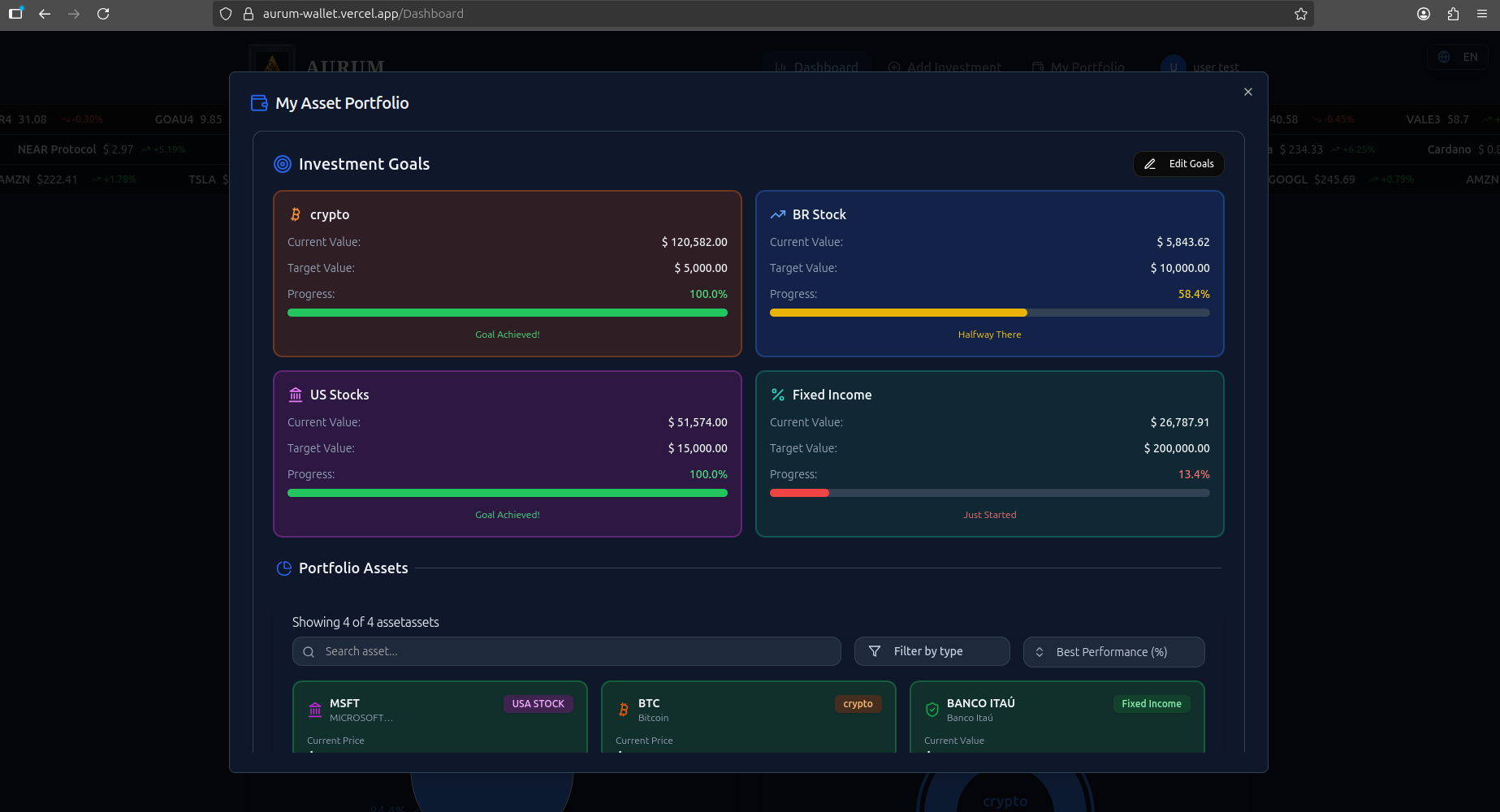 Aurum FrontEnd — Real‑time Investment Dashboard. React frontend for portfolio tracking and real-time quotes, focusing on network resilience, responsive UX and extensible architecture. Integrates WebSockets for market streaming and REST API for secure operations.
